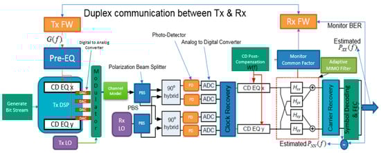 where X is frequency-domain (Fourier transform) representation of the decoded symbols (at the input of the Forward Error Correction (FEC)), representing the estimate of transmitted symbols, and its power spectrum density is defined as Pxx. Y is the Fourier transform of the received symbols at the input of the receiver filters. Hc is the estimate of the static portion of channel frequency response. G is the frequency domain of pre-compensation coefficients applied at the Tx and N is the Fourier transform of the total noise, with power spectrum density PNN, estimated from the error used in the adaptive filters’ coefficients update. When the cost function is specified the minimum square error, then Wiener equalization/filtering is the optimal solution [30]. Based on the familiar orthogonality principle [31], where the optimal filter is estimated based on the error being orthogonal to the data being used. We define and as, respectively, the cross-correlation between the input and the output and the auto-correlation of the input.