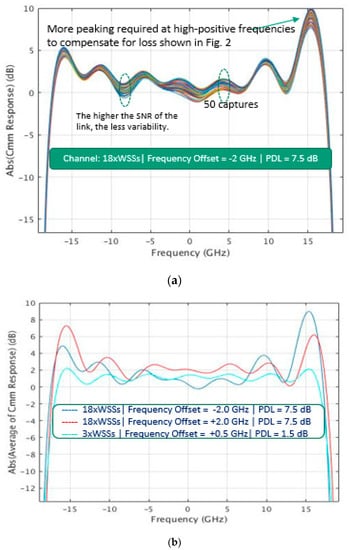 Since the frequency responses of the filters have intense drooping at high-frequencies, and the center frequency is at an offset (which emphasizes one side of the spectrum), we can see more peaking of about 5 dB on the high positive frequencies compared to negative ones. In the mid-range of the frequency response, the ripples are compensating for both the ripples in channels and the residual ripples from Tx EO/Rx EO/DAC/ADC calibrations. The average of the retrieved common responses of three different scenarios, displayed in Figure 3b, are used in the optimization process. The approximation of the shift in the center frequency, from the International Communication Union (ITU) center frequency, is embedded in the estimated frequency response; it is visualized when comparing blue and red curves below. The x-axis is the index of the frequency bins used in the operation, they are mapped to −20 to +20 GHz, i.e., +/−sampling frequency/2 (referred to as Fs/2). Since PDL accumulates in a link mainly due to birefringent elements, such as mechanical stress or variability in the manufacturing process as described in [27], and Wavelength Selective Switches (WSS), as detailed in [28]; therefore, we modeled the maximum PDL in association with filtering.