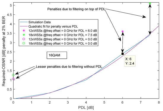 We notice that the ROSNR penalty, at 2% (=0.02 or 2 × 10−2 BER, versus PDL can be fit to a quadratic function. The penalty of PDL equal to 7.5 dB is aligned with the results reported [33]. As well, as expected, the penalty when aggregating PDL and filtering impairments is bigger than adding the penalty of each impairment tested individually. The reason for the ROSNR penalty is that both impairments are inducing colored noise that affects amplitude. Since the receiver is equalizing the signal so it brings back the two polarizations to be equal and the spectrum to be flat, then the noise will be boosted as well. Therefore, both PDL and filtering can’t be corrected, as PMD and chromatic dispersion, but can only be compensated.