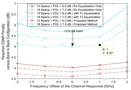 With 18xWSSs and PDL of 7.5 dB, splitting the compensation of the steep loss at high frequencies between the Tx and Rx, with minimum mean-square-error at receiver as criteria, reduced the ROSNR by 0.6 dB compared to 0.3 dB when performing pre-compensation only (as shown in Figure 6). The penalty versus center frequency offset, due to the mismatch between the carrier frequency and center of concatenated filters, is highly dependent on the symmetry of the frequency response of the channel, EOs and frequency response of data converters. The reason is that all the frequency responses will be multiplied by the signal, with noise added at different stages of the propagation chain, prior to being processed by the receiver. As expected, and similar results to data presented in [34], the penalty versus frequency offset has minimal around 0 GHz and gets larger on both positive and negative edges. As in other published results [11], compensating for the phase information of the filtering effects did not make a difference in our data. It was noticed that the phase distortion is dealt with properly in the adaptive filters at the receiver.