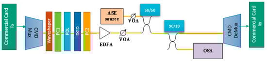 The LCoS-based 1 GHz resolution waveshaper was used to mimic two different optical links, as shown in Figure 1b, with the frequency responses of both CMD Mux and Demux subtracted. Instead, we used real AWG-based CMD at both sides, which helped to filter the noise before the signal is received. PMD emulator was programmed to introduce 30 ps. Variation in PMD, along with state of polarization, can be corrected at the receiver with no penalty. Its introduction here for completeness to mimic both random birefringence in fiber links and not directly related to WSSs. As well, based on results shown in [40], using a high-resolution measurement technique, a MEMS-based WSS has an upper-bound PMD value of 30 femto-second per port. The commercial card was set in loopback through the experimental work, therefore once acquired, the laser was centered at ITU wavelength of 1546.92 nm (equivalent to 193,800 GHz), and only dithering within a frequency range of 200 MHz since it is locked to itself. An optical spectrum analyzer with a fine resolution of 300 MHz, using 90/10% splitter, was used in the measurement of the transmitted spectrum with and without pulse shaping, and filtering effects programmed at the waveshaper. The sweeping of OSNR was done with varying the setting of VOA. The setup was characterized according to IEC 61280-2-9 standard. To minimize error, all reported OSNR values are the average of 10 consecutive measurements, with accuracy within 0.1 dB.