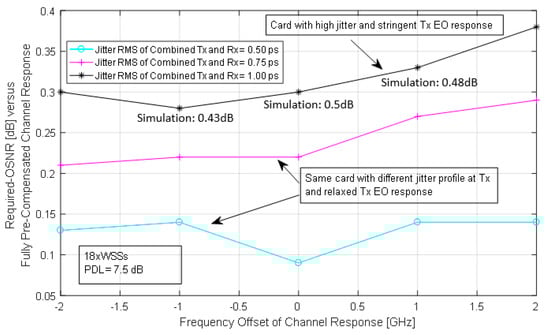 In Figure 8, using two commercial cards, the advantage of using the proposed method is presented for different jitter profile and various Tx EO responses. A maximum gain of 0.38 dB in Required-OSNR is measured when the total jitter root-mean-square (RMS) is 1 picosecond (ps), equivalent to 3.5% of unit-interval (UI). With DAC PLL is jittery and the EO response has steep roll-off at high-frequencies, equal 6 dB loss at 15 GHz, balancing the compensation of the channel filtering has a high-gain compared to performing only pre-compensation. Especially that the clipping effects, at the Tx filter, introduce a bias noise that impacts the SNR. The clipping is caused by the necessity to peak more than the maximum allowed magnitude per frequency bin. For lower jitter (i.e., better clocking quality), as we will discuss in detail in Section 7.1.3 below, and relaxed Tx EO response of 3 dB loss at 15 GHz, the gain is less obvious. With the same card, i.e., same EO responses to ease comparison, when jitter RMS is 1.8% (0.5 ps) and 2.7% (0.75 ps) of UI, the gain is up to ~0.26 and ~0.15 dB, respectively.