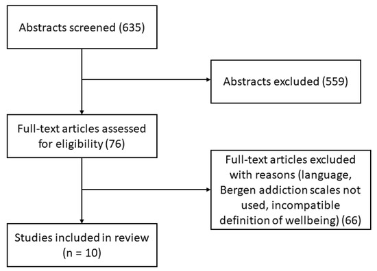 Among the 76 results, 49 were excluded because BFAS, BSMAS, or BSNAS were not used but only mentioned. Eight other sources were also excluded because no suitable measure of well-being was employed. Indeed, in these eight studies, well-being was not defined according to the World Health Organization (WHO) definition [41]. WHO refers to health as a state of complete physical, mental and social well-being and not merely the absence of disease or infirmity. Thus, for instance, those studies that refer to well-being as a lack of psychological conditions (e.g., depression) were excluded. Only the sources written in Italian or English were included, so five more results were excluded because they were written in other languages. The other four papers were excluded because data analysis was not suitable for the systematic review process (e.g., lack of descriptive statistics, no correlation coefficients provided for the variables of interest). Finally, it was possible to identify 10 studies that describe the correlation between BFAS or BSMAS or BSNAS, and some measure of well-being [15,42,43,44,45,46,47,48,49,50].