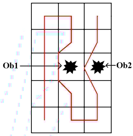 Figure 16. Subdivision for the grid Box G for the fourth obstacle.At the end of the mission, the resulted path by the basic approach is presented in Figure 17a. The total path obtained by our work is shown in Figure 17b.