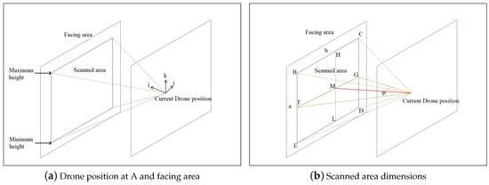 After locating the drone in the (i, j) plane, the planner will decide to range the minimum and maximum allowed heights for the drone (denoted and , respectively). This range will specify the frame dimensions of the facing area. We denote F as the scanned front frame. We assume that the drone is located at point A, with height .