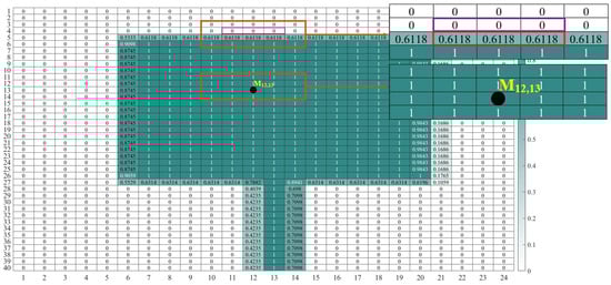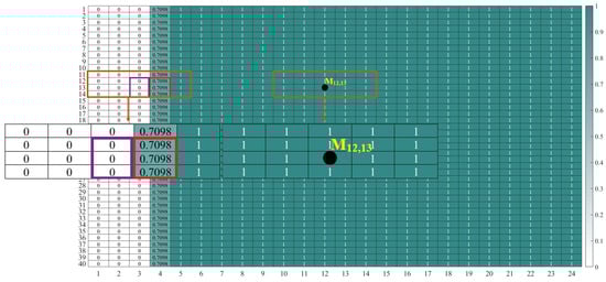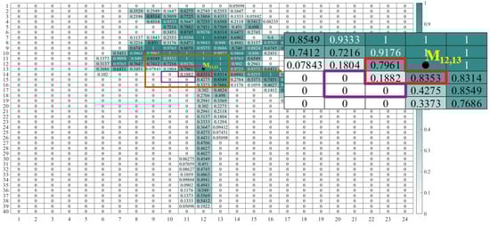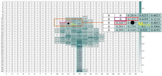 Figure 4. Example of a tree Heatmap in the frame. The drone position is (12, 13). The red box represents boundary cells, and the purple box represents solution cells.We denote the set of non zero-cells in the grid ( ): - Step 2: To recall, M is the projection of A in the frame. We check its position in the grid. If M is located in a cell in , then no obstacle is on the drone’s way. The current path will not be modified. However, if M is located at a non-zero cell (i.e., a cell in ), then the obstacle exists on the drone’s way. Hence, the path should be modified. For this purpose, we will investigate the list of cells surrounding M to find a loophole for the drone and make a detour.We denote the neighbors of a grid-cell . It is the list of cells that directly surround :We denote the nearest non-zero cells to M that are in (see Equation (7)). We call them boundary cells. We denote d(v1,v2) the Euclidean distance between two points v1 and v2:We aim to find the nearest to M and such that belongs to . We denote the set of solutions, where n represents the number of white cells that directly surround :To find the list of solutions , we loop in a reverse spiral mode from M (see Figure 5) until we reach a shell that contains cells with .