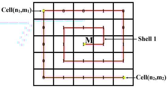 Algorithm 2 () looks for the list of possible solutions around M in the surrounding shells in a spiral mode starting from M. The list of solutions is filtered by Algorithm 3 () to choose the nearest possible solution cell to M which could be the next drone’s position.