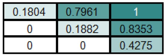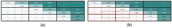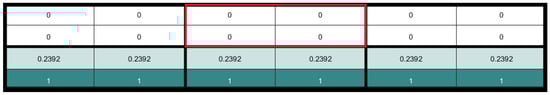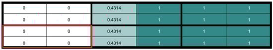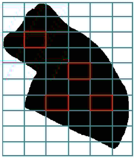 - Step 1: A heatmap of the frame F is generated. To exemplify, Figure 4 shows a 24 × 40 heatmap of a tree in the frame:where represents a grid cell element in . We denote the set of zero-cells in the grid: