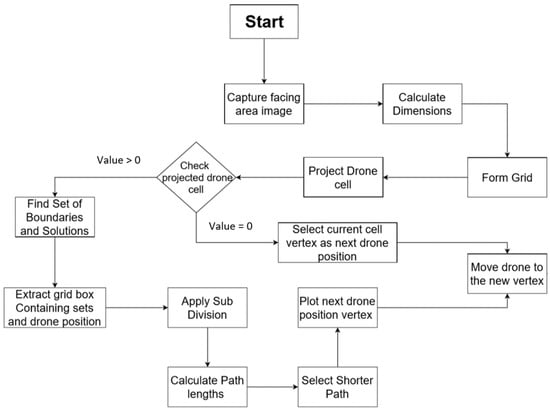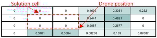 The flowchart in Figure 8 summarizes the main steps in our work. Algorithm 1 checks the current drone’s cell-position (named M) in the facing area. If M is located in a zero-value cell, it becomes the new drone’s position. Otherwise, the algorithm checks the neighboring cells to find the nearest non-zero value cell.