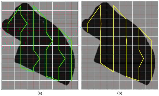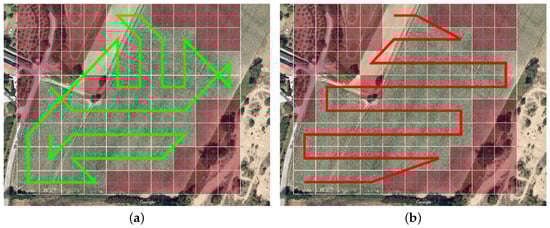 Figure 22. Trajectory Planning in our work versus the work in [31]. (a) trajectory planning by Di Franco et al. [31]; (b) trajectory plan by our work.Table 2 shows that our path is 3.89% shorter than the path in [31]. It also shows a reduction of 37.77% in the total turn angles. This means better energy saving. Results show that the mission completion time is reduced by an average of 15.22% in our work, with energy saving of 11.30% compared to the results obtained in [31].It should be noted that the area is not totally covered by the work in [31]. The cell that contains obstacle (example cell (4,4)) is discarded. However, if the obstacle belongs to a small part of the cell, it is better not to discard the whole cell if there is a possibility to avoid it while maintaining a higher coverage. In our work, by tackling the frontal view, we can have a better understanding of the obstacle location which ensures a better coverage of the area.Authors in [31] declare that the cost function presented in the original approach in [10] has not been able to achieve an optimum energy solution. Therefore, they revised the cost-effectiveness and updated the cost-function. They proposed an approach based on an accurate energy model that correctly estimates the energy needed to complete the coverage mission. They showed that their work achieves minimum energy consumption. Our work achieves 11.3% energy gain over the work in [31] which in turn achieves a gain up to 17% over the approach in [10]. Moreover, our work achieves complete area coverage with shorter path over the work in [31], as they avoid the whole obstacle cell which results in more number of turns and less coverage rate.Figure 23a shows the gain in completion time in our 3D work vs. 2D work while increasing both the speed and rotation rate. Figure 23b shows the gain in completion time while increasing the speed and decreasing the rotation rate. Results show that the mission completion time is reduced by an average of 15.95% in EAOA compared to the results obtained in [31].