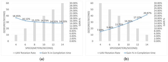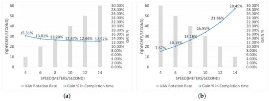 Figure 23. Gain in completion time. (a) gain in completion time in our work compared to [31] while increasing both speed and rotation rate; (b) gain in completion time in our work compared to [31] while increasing speed and decreasing rotation rate.
