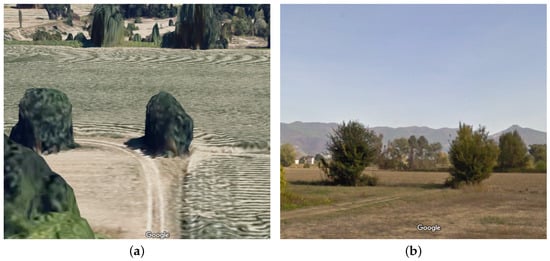 Figure 21. The Facing area in cell (4,4). (a) Google Maps 3D image for the cell containing obstacle; (b) Google Maps street view image for the facing area.The green line in Figure 22a represents the path generated by [31]. The red path in Figure 22b is generated in our work.