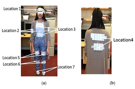 The experiment was performed in the enclosed Sensor Design, Antenna and Propagation and Radio Frequency laboratory of the Faculty of Engineering and Informatics, University of Bradford. Different physical materials including furniture were placed within the activity sensing perimeter of 5 − 5 m2 to simulate real-world scenario and achieve effective detection range. Moreover, two circularly-polarised Alien RFID readers operating at the European UHF of 866 MHz with 5.5 dBm gain were used to read the RFID tags. The RFID reader antennas were placed at a maximum height of 2.34 m to achieve maximum detection and resolution. Fifty-six lightweight, commercially-available passive RFID tag of dimensional geometry 74 mm × 21 mm and a read range of 6 m with known ID_value was attached to seven distinct positions on the target. Each distinct tag location on the target was monitored by a set of eight tags as illustrated in Figure 1. Different physical objects to simulate real-world object occlusion were placed within a few metres of the target. Table 1 highlights the seven tag locations selected on the target. The seven distinct tag locations were selected since these locations were associated with various activities of daily living.
