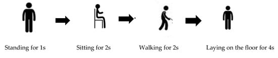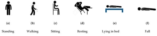 Moreover, Figure 2 illustrates the six basic activities of daily living positions in the present experiment. Five positions including standing, walking, sitting, resting and lying in bed, which relative health indicators and fall, which are identified as common causes of domestic accidents are sampled.