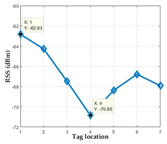 Table 2 highlights the computed RSS readings for walking for all six volunteers. It can be seen that the tag location_4 (i.e., back) has the highest RSS which indicates NLOS between the tags and the RFID readers. Tag location_1 (head) readily possess the lowest RSS as there is increased LOS between the tags and the RFID reader, as shown in Figure 3.