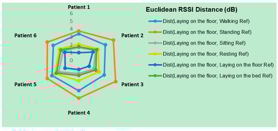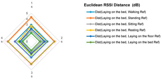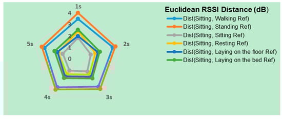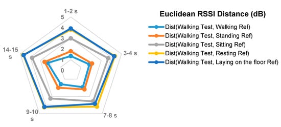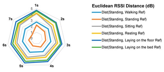 Figure 4 shows that the proposed system accurately identifies walking as the smallest distance in all time periods, indicated by the outer polygon. It is worth noting that since the walking speed of the patient is relatively high compared to standing in the position, the RSSI variation for walking and standing is 3 dB which shows good correlation. Moreover, seven iterative samplings of standing position of 7s in each sampled iteration are recorded. The Euclidean distance for the standing activity is performed as presented in Figure 5. In Figure 5, it is shown that the standing position exhibits the lowest RSSI of 0.5 dB, which indicate the nearest true position detected. Moreover, it can be seen that the second nearest position is inferred by the proposed system is walking.
