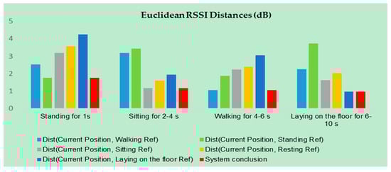 Figure 9 illustrates different human activities with concurrent changes in the target for standing 1 s, sitting for 2 s, walking for another 2 s and falling whilst remaining in the position for the next 4 s. The result of these scenarios is illustrated in Figure 10. From Figure 10, it can be seen that the system accurately infers the true position at each activity phase based on the smallest distance calculated in comparison with all the other referenced positions.