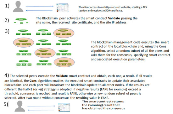 Assume that a web server is and the server certificate is , and the i-th client/browser () is associated with the i-th of our blockchain. When the has to decide to accept or not the certificate sent by server , it will accept the certificate only if the execution of the smart contract that checks the certificate validity returns OK or KO, meaning that all the other peers (the random subset chosen using our novel consensus algorithm) involved in the consensus gave OK or KO, and the tuple (ipServer, server name, certificate) is appended to the ledger with a positive/negative attribute.