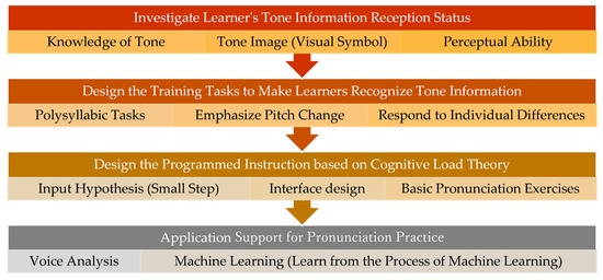 Based on the related research and theory in the previous section, we considered the intrinsic cognitive load (Difficulty of speech recognition, complexity of information received by learners), extraneous cognitive load (Information that is not expected to be effective in learning tones, teaching material interface, and operation design, etc.), and germane cognitive load (The instructional design and feedback to promote tone understanding) of the general learning method. The research procedure is shown in