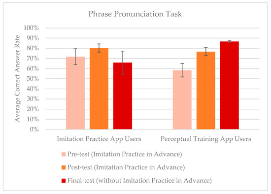 To confirm the learning process and phrase pronunciation ability, we conducted an experiment with a pronunciation pre-test. The pronunciation pre-test was performed after providing the tone templates model voices to participants three times. Carrying out the pre-test made the performance of participants improve by about 20% after training with the application. The performance of the perceptual training application users were 17% and 7% higher in the basic pronunciation tasks than the users of the imitation pronunciation practice application. The correct answer rate improvement of the perceptual training application users before and after training were more than double the improvement of the imitation pronunciation practice application users. Furthermore, canceling the imitation practice before the phrase pronunciation test made the imitation pronunciation practice application users perform worse in the phrase pronunciation test. However, the perceptual training application users continued to improve their performance in the phrase pronunciation tests. The experimental results of the phrase pronunciation pre-test, first test, and second test (canceling the imitation practice before the second test) are shown in