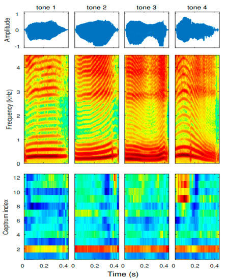 34] showed that tone recognition by machine learning is possible; however, there are some shortcomings in learning tones with the tone recognition system. This study used children’s speech, which had limitations on the pitch range, and the spectrogram and MFCCs of pronounced monosyllabic words in the paper showed that the third tone was a dipping-rising tone (