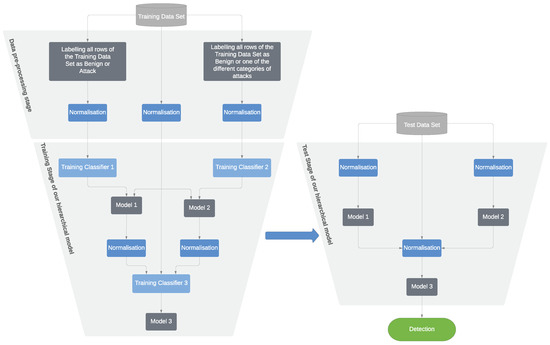 As illustrated in Figure 1, in order to test our hierarchical model, we process each row of the test data set by model 1 and model 2, then we add the outputs of model 1 and model 2 to the features of each row, and finally, we process the result rows by model 3 that classify it as benign or a specific type of attack.