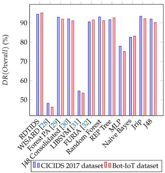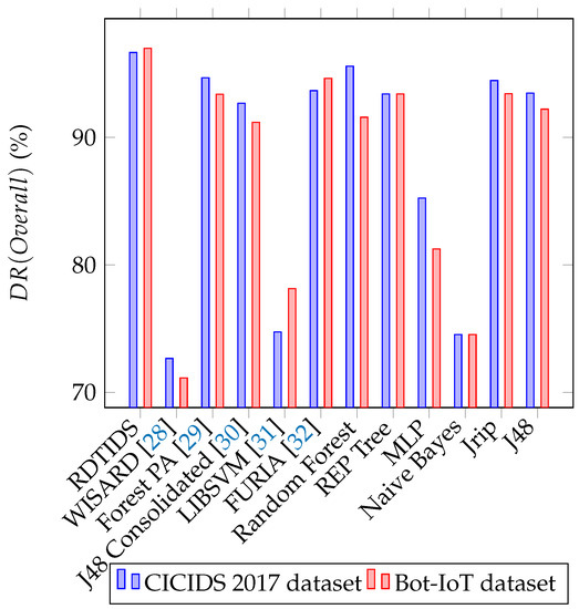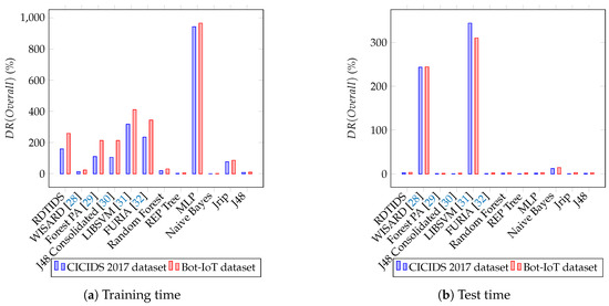 Figure 3, Figure 4, Figure 5 and Figure 6 present the overall performance of RDTIDS and other classifiers in terms of false alarm rate, global detection rate, accuracy, training and test time, respectively. In terms of detection rate, RDTIDS gives the highest overall detection rate (DR Overall) with 94.475% and 95.175% in CICIDS 2017 dataset and Bot-IoT dataset, respectively. In terms of accuracy, RDTIDS gives the highest accuracy with 96.665% and 96.995% in CICIDS 2017 dataset and Bot-IoT dataset, respectively. In terms of false alarm rate (FAR), RDTIDS gives the lowest false alarm rate with 1.145% and 1.120% in CICIDS 2017 dataset and Bot-IoT dataset, respectively. The training time of RDTIDS is 195.5 s and the test time is 2.27 s, which represents an acceptable training and test time for a hybrid hierarchical model especially when compared to simple models such as MLP and SVM.