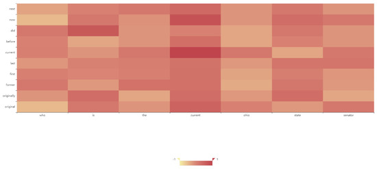 We visualized the attention matrix and checked it whether obtains temporal information in questions. Figure 4 reveals the attention heatmap generated from a test question “who is the current Ohio state senator?”. We can see that the attention matrix successfully obtained the temporal information (current) from the question, so we can further strengthen the question vector through the extracted information. In other words, in the question “who is the current ohio state senator?”, the word “current” implied temporal information. In the attention matrix, value of the word “current” is the highest, thus there is temporal information in the question, so we can strengthen the question vector in this way.