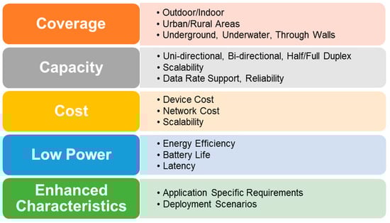 Coverage is of fundamental value to almost all LPWAN applications, and hence it is identified to be of high relevance for most of them. However, a typical manufacturing environment may entail localized operations. In such a case, tradeoffs may be carried out to focus on the types and number of devices to be supported, and coverage requirement may be compromised. Low power operation is driven primarily by the non-availability of electric power supply, for example, agricultural applications. In such situations, various sensors are far out and sometimes in difficult to reach locations, and hence batteries lasting 10+ years without recharging are needed. Low power operation is considered to be of high significance in such applications. In others, for example, retail, electric power may be readily available, and low power operation may be considered of low priority. In many instances, an application with the massive number of devices requires very low cost devices, for example, smart metering, whereas others like smart homes may be able to absorb reasonable cost. This is hence captured as of low relevance for such applications. The major attributes for these characteristics [