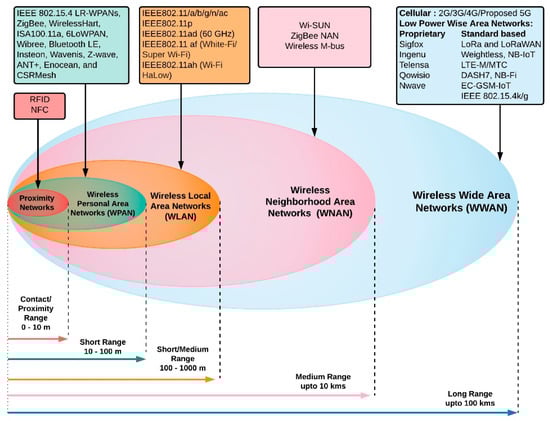 Wireless access networks for IoT applications span different geographic ranges, as shown in