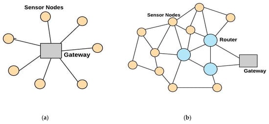 Figure 3a. A star network consists of one gateway node to which all other nodes connect. Nodes can only communicate with each other via the gateway. Node messages are relayed to a central server via gateways. Each end node transmits the messages to one or multiple gateways. The gateway forwards the messages to the network server, where redundancy, errors, and security checks are performed. Star networks are fast and reliable because of their single hop feature. Faulty nodes can also be easily identified and isolated. However, if the gateway fails, all the nodes connected to it become unreachable. As the end node sends messages to multiple gateways, there is no need for gateway-to-gateway communication. This simplifies the design as compared with networks where the end nodes are mobile. Mesh topology network consists of a gateway node, sensor nodes, and sensor-cum-routing nodes connected, as shown in