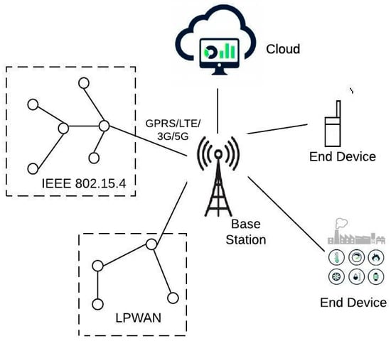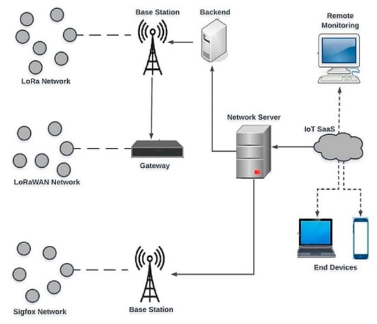 Figure 6. It shows an example where devices have access to both LoRa and Sigfox systems. Such multi-technology resident hybrid networks are particularly relevant for complex applications requiring different LPWAN technologies. Each LPWAN technology collects the data from the devices and nodes located in their coverage areas. The corresponding base or access stations are deployed consistent with their coverage area. The LPWAN gateway or nodes can communicate the user traffic data to the core network and the cloud. In such a mixed architecture, the associated network server or core network entities perform the functions of device management such as registration, authentication, resource allocation, and data traffic management to the devices connected to their network.