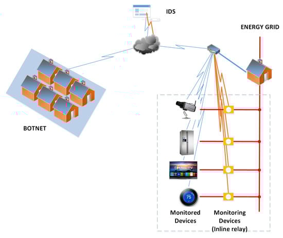 The topology of a final solution is presented in Figure 1, where any home connected to the Internet may use the services of an IDS provider. To date, a botnet of smart devices attacks either the IDS or the targeted device. The second scenario is in the scope of this paper. Each smart device is connected to the energy grid (power supply) via the proposed monitoring devices and to the Internet via the router. Any deviation from the expected operation is reported to the IDS and at the same time, fail safe procedures may be triggered, based on security policies. In this work, research was focused only on anomaly detection.
