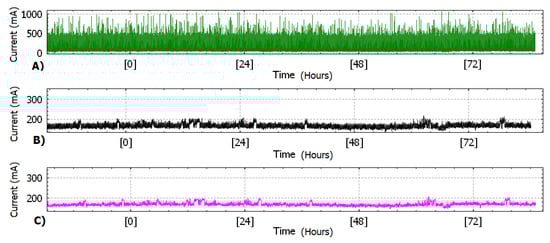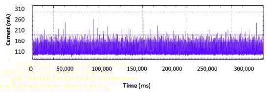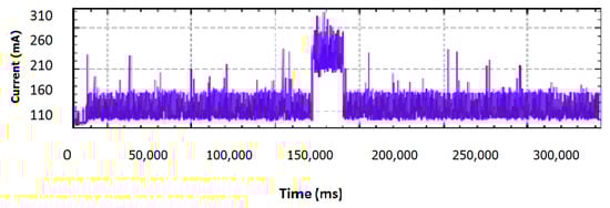 In this scenario, a DoS attack was performed against the device, while its normal functionality was executed: collecting data. The measurements regarding supply current were captured in order to observe the device’s network activity and the values are depicted in Figure 6.