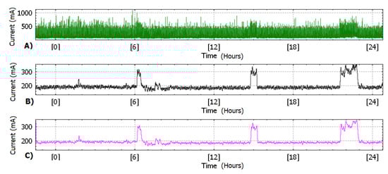 In this scenario, the microelectronic device performed periodical capturing of current values. An external environment factor did not exceed normal characteristics and an attack was not performed, in order to construct a baseline profile of the power amperage under normal conditions’ operation for comparison reasons. This profile (Normal) is depicted in Figure 5, showing three charts in time (hours) on the horizontal axis. In Figure 5A the supply current of the device is displayed as measured by the external circuit. In Figure 5B the smoothing filter was applied, where the power fluctuations is distinguished, and finally, in Figure 5C, the second pass from the same filter is offered.
