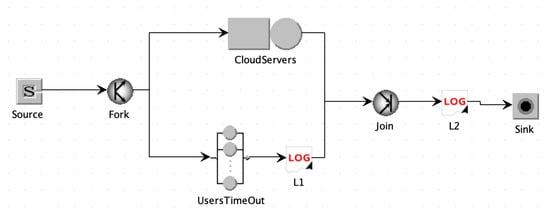The queuing network depicted in Figure 2 models the application of Figure 1. It is composed of a fork/join that splits a request into two tasks: one models the real request execution (upper branch) and the other represents the occurrence of timeout due to user abandonment (lower branch). The execution of the service demand is modeled by K servers queuing node, while the timeout is modeled by a delay node. The join node waits until the first task is executed (in this case, the quorum is equal to one). The probability distribution taken into account to describe the service demand is hyper-exponential with an average duration of 1 s and a coefficient variation of 5. The timeout is considered to be deterministic, and arrivals are assumed to be generated according a Poisson process: both the duration of the former and the rate of the latter are varied during the study of the model. The two loggers and in Figure 2 track the instant of time the request in execution flows through them and allow to compute the probability that a request ended due to timeout. In particular, since the join has zero duration, a request that ends due to timeout will have the same timestamps recorded by both the loggers.