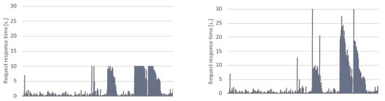 In [], the authors examined a specific class of services (Infrastructure as a Service (IaaS)) discussing Application Response Time (ART, “the time taken by the application to respond to other users’ requests”) as a metric. Specifically, the accounted tasks are described according from two perspectives, computation intensive and communication intensive tasks: the former is decomposed in the analysis of CPU and memory consumption, the latter being monitored by network tools (or even by using SMNP agents). In [], the author considered an extended set of parameters determining the performance of a cloud architecture service, such as: (i) response time; (ii) throughput; (iii) availability; (iv) utilization; (v) resilience; (vi) scalability; and (vii) elasticity. Hybrid architecture performance is the focus of the work by []. The authors reviewed the paramount design parameters such as the proportion of resources on edge side vs. cloud side and the latency of edge clouds in order to determine measure indices in the shape of the average response time and service goodput.
