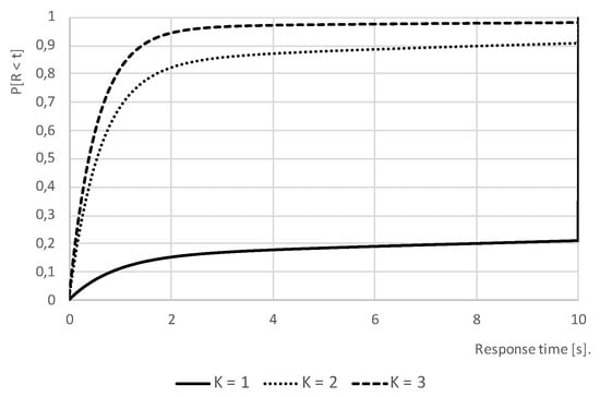 Distributions of response time with Timeout = 10 s and r/s for a variable number K of VMs.