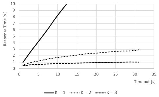 Behavior of Response Time for timeout ranging from 1 to 30 s, r/s for a variable number K of VMs.