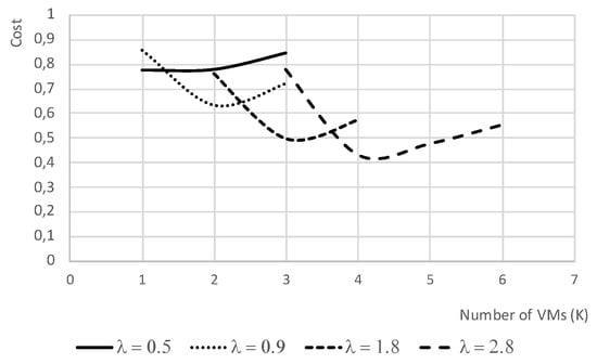 Finally, Figure 6 studies the trade-off user satisfaction and deployment cost, by defining a metric: where U is the average utilization of the VMs and is the probability that a timeout event occurs, as identified by the two loggers. When the system is deployed on a small number of VMs, the utilization is very high (hence, is close to zero), but also the timeout probability is close to . Conversely, when the system is deployed on a large number K of VMs, the time probability is close to , but also the utilization is very low, making . The best configuration of the system is thus the one that minimizes this cost. For an arrival rate of r/s, this occurs at , while, for r/s and r/s, at and , respectively. Note that, in these cases, respectively, and could not have been used since in such circumstances the system would have not been stable. For r/s, the best solution seems to be , since having a second VM does not sufficiently decrease the timeout probability.