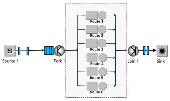 The layout of the model is shown in Figure 7. It consists of a fork/join region with a capacity limited of one request. Each arriving request is split at the Fork into six tasks that are executed in parallel. Each task represent a different algorithm for the route computation and is executed by a dedicated processor represented by a Delay node.