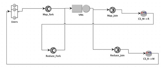 Modeling of the MapReduce paradigm, on the other hand, reflects the business requirements related to the need to develop a strategy capable of allocating the optimal number of resource by minimizing, in parallel, the involved costs in deploying complex architectures. In this sense, Hadoop’s performance analysis represents a crucial indicator that can be evaluated only through a valid model. In contrast to the approach used in Section 3.3, in [], the authors used JMT to develop simulation models based on finite capacity region (FCR) deploying QN and Stochastic Well formed Nets (SWNs). It is worth noting that some behaviors, such as the dynamic container allocation, are rather complex to abstract, although the results achieve accuracy.