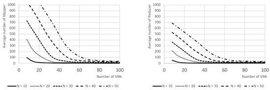 Figure 11 shows the average number of tasks in execution in the VMs for the map and the reduce stage. As expected, it grows with the number of users N, and decrease with the number of K VMs. It is interesting however to note how the decay is not linear, but not even clearly hyperbolic: this is due to the different configurations of the map and reduce stages.