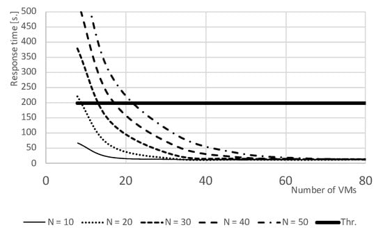 The system is studied for a different number of users N, starting with and up to , for different parallelization levels K (corresponding to the number of acquired VMs).