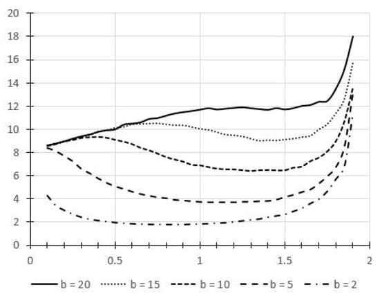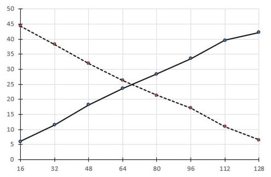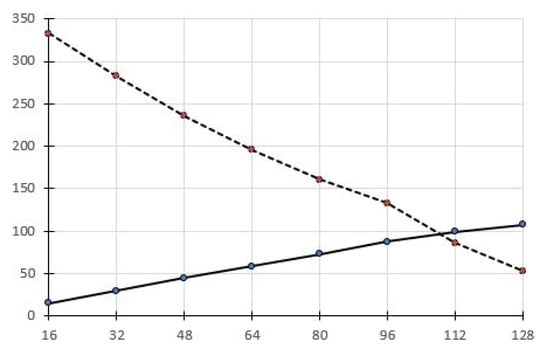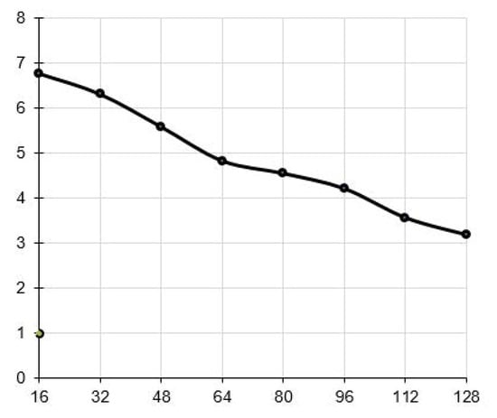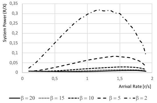 As expected, with batch size , the number of transmissions per second are the highest, while the minimum for . However, to have a meaningful result, these values should be considered together with the system response times. To this end, the metric system power, introduced in [] and combining the throughput X of a system with its response time R, is considered. This metric is the ratio X/R of throughput and response time, and captures the level of efficiency in executing a workload. The maximum power corresponds to the optimal operating point for the system, i.e., the point at which the throughput is maximized with the minimum response time. In our system, we have considered the ratio of transmissions/s and aystem response time. Figure 23 shows the ratio of the two metrics of Figure 22 and Figure 21.