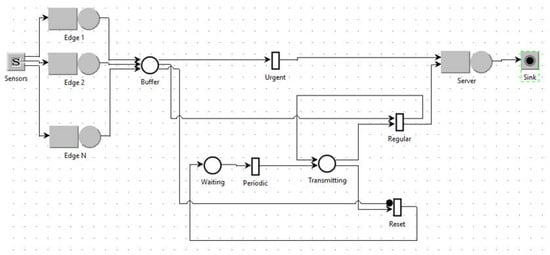 The implemented algorithm considers the number and types of signals detected by the sensors connected to the edge nodes, the fluctuations of arriving traffic considered regular and the arrival patterns that must be transmitted with , as they can be associated with a patient in critical conditions. The most important elements of the implemented model simulating this algorithm are described in the next section.