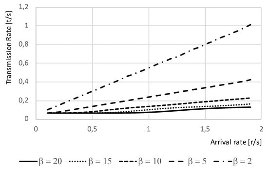 According to the objectives of the study, the R values should be analyzed together with the cost (energy consumption) for transmissions. It is assumed that the cost is directly proportional to the number of times a batch is transmitted, i.e., a buffer is emptied. Indeed, the greater are the number of times and the sizes of the transmitted requests at the same time, the better is the energy efficiency of the system. In Figure 22, the transmissions per second are shown for all the values of the considered .