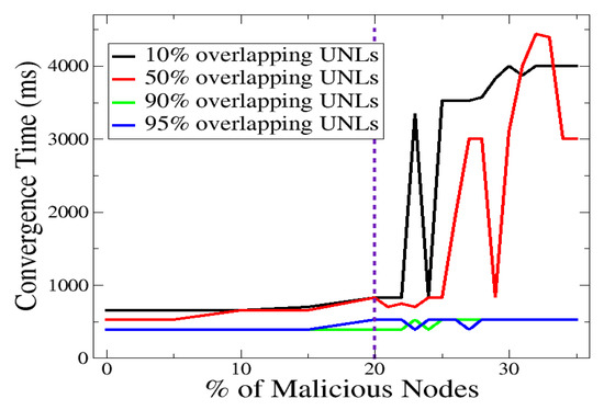 This is shown for various percentages of the UNL overlap, namely, , , , and . (These values are representative and adequately cover the parameter’s space. That is, in-between UNL overlap percentages consistently yielded analogous performance scores. They are not depicted for the sake of plot’s readability.) Overall, we observe that low convergence times (less than 1000 ms) are achieved when and UNL overlap is applied. A key observation deals with the broad separation of the considered operational space, in terms of UNL overlap, into two regions, and , denoted as and , respectively. Regarding , all convergence times lie below 1000 ms, while the utilization of and UNL overlaps exhibits better performance compared to the case of and UNL overlaps. Within the region, the use of and UNL overlaps exhibits a non-robust behavior yielding convergence times that reach, and occasionally exceed, 4000 ms. These observations suggest that high UNL overlaps are needed only when the percentage of malicious nodes increases beyond a certain threshold. This threshold is (empirically) shown to be approximately equal to .