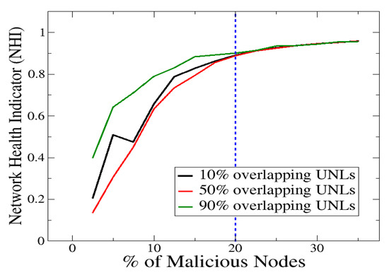 Network Health Indicator (NHI) vs. percentage of malicious nodes for various UNL overlaps.