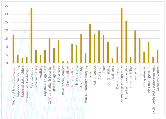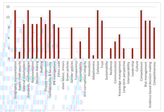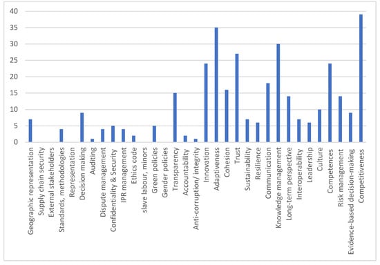 In the phase of Secondary analysis, the results of the preliminary analysis for each type of primary source—extracts from normative documents and academic sources, bylaws of existing networked organisations, and interview transcripts—were processed using both qualitative and quantitative analysis [39,40]. Content analysis was used to highlight issues of interest and group them in categories of governance issues (needs, objectives, requirements). Then, the information on each primary source was coded vis-à-vis each governance issue/category, i.e., assigning “1” if the governance issue is referenced in the text or the interviewee considers it important, or “0” if it is not or the interviewee sees it as not sufficiently important to comment. The same coding method was applied to excerpts from normative documents, academic publications, and documents of existing networks.